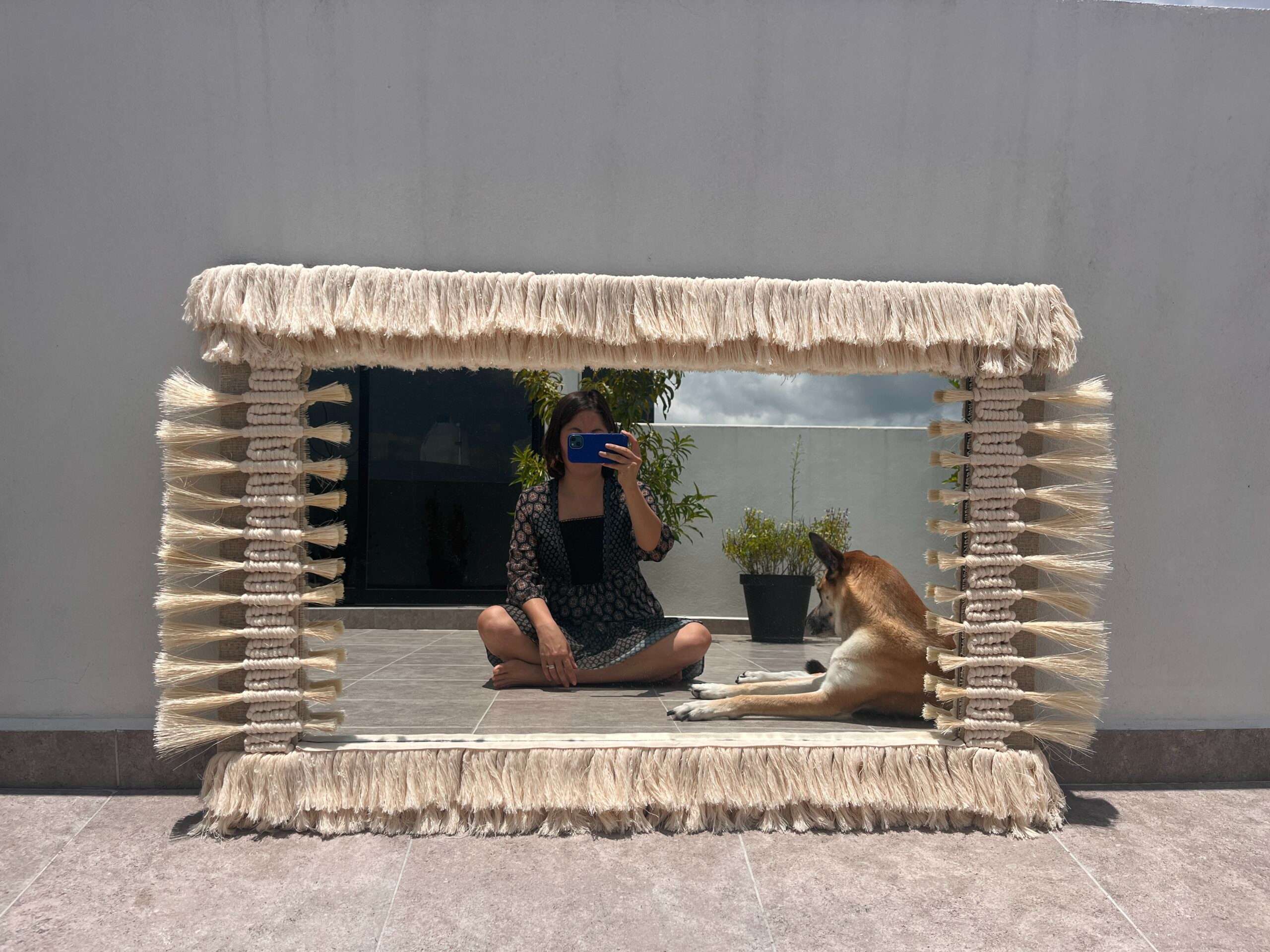 Flequillos reciclados en combinación con tiras de ixtle anudado desbordan fuerza y técnica en este espejo.