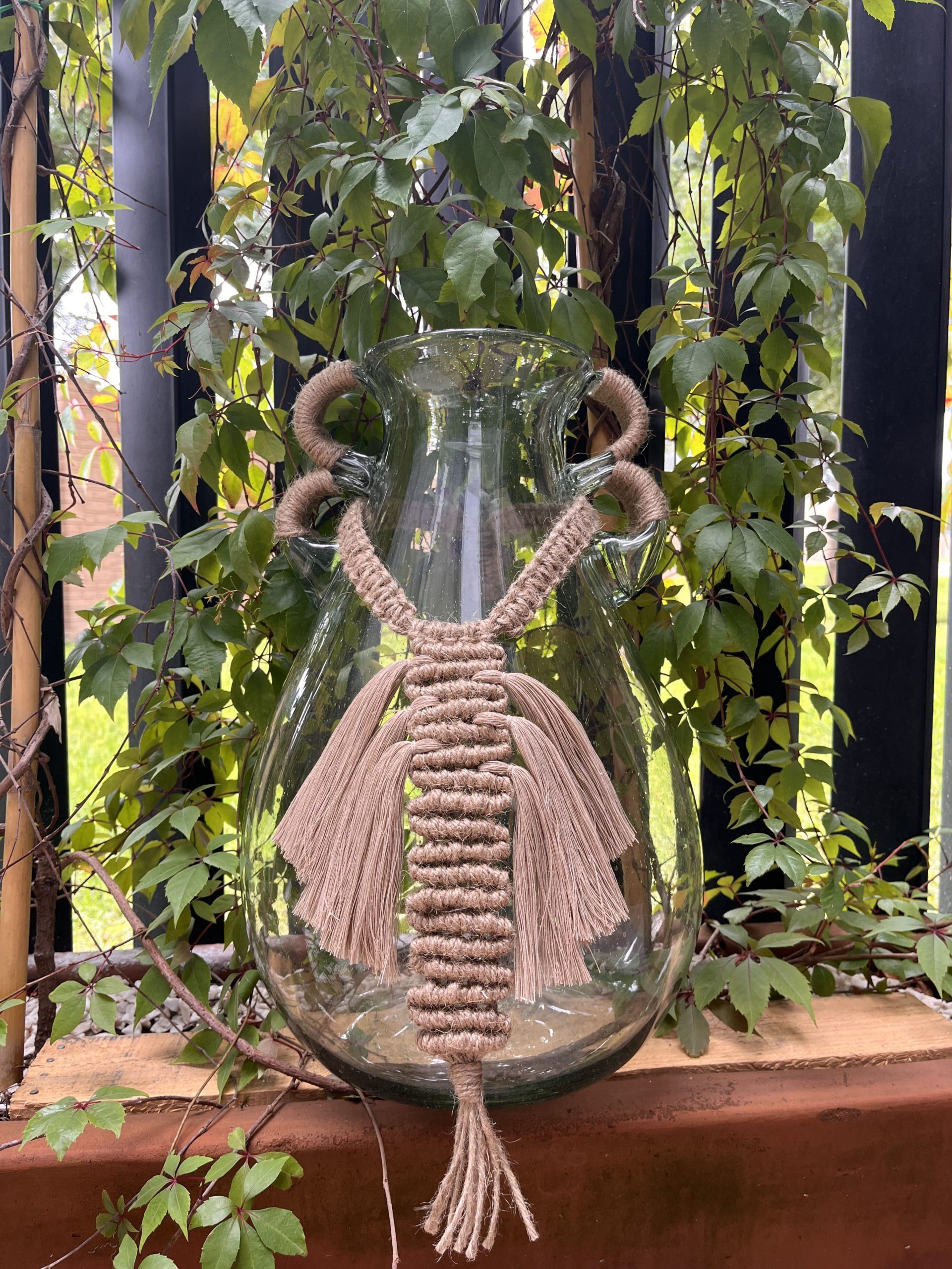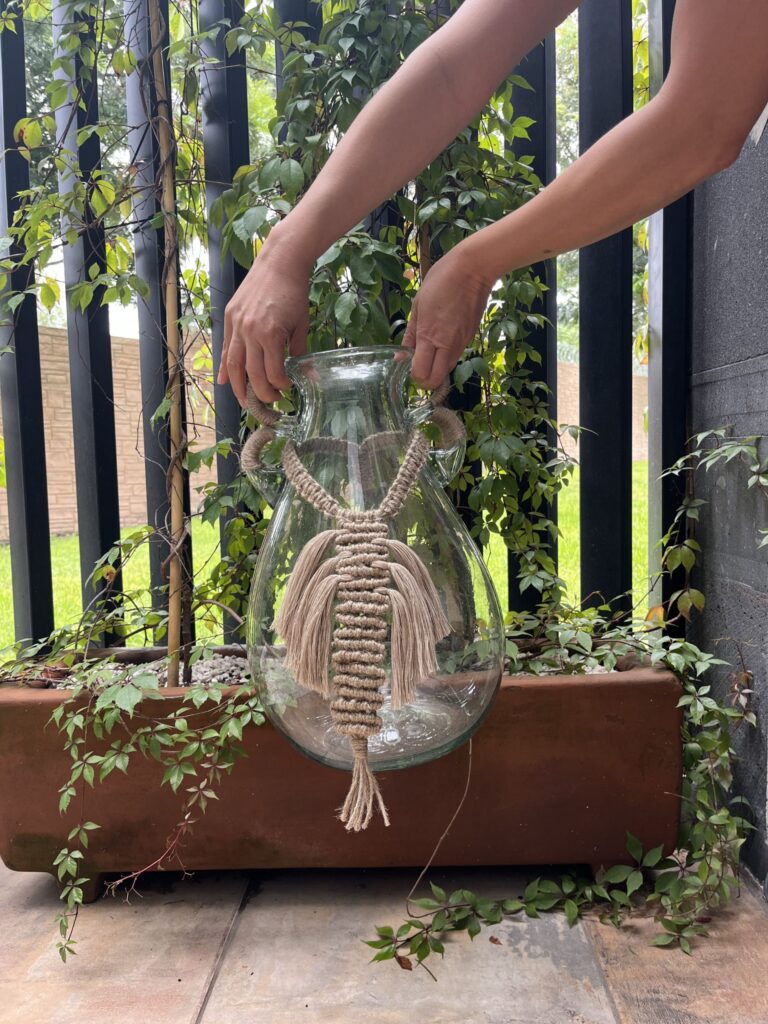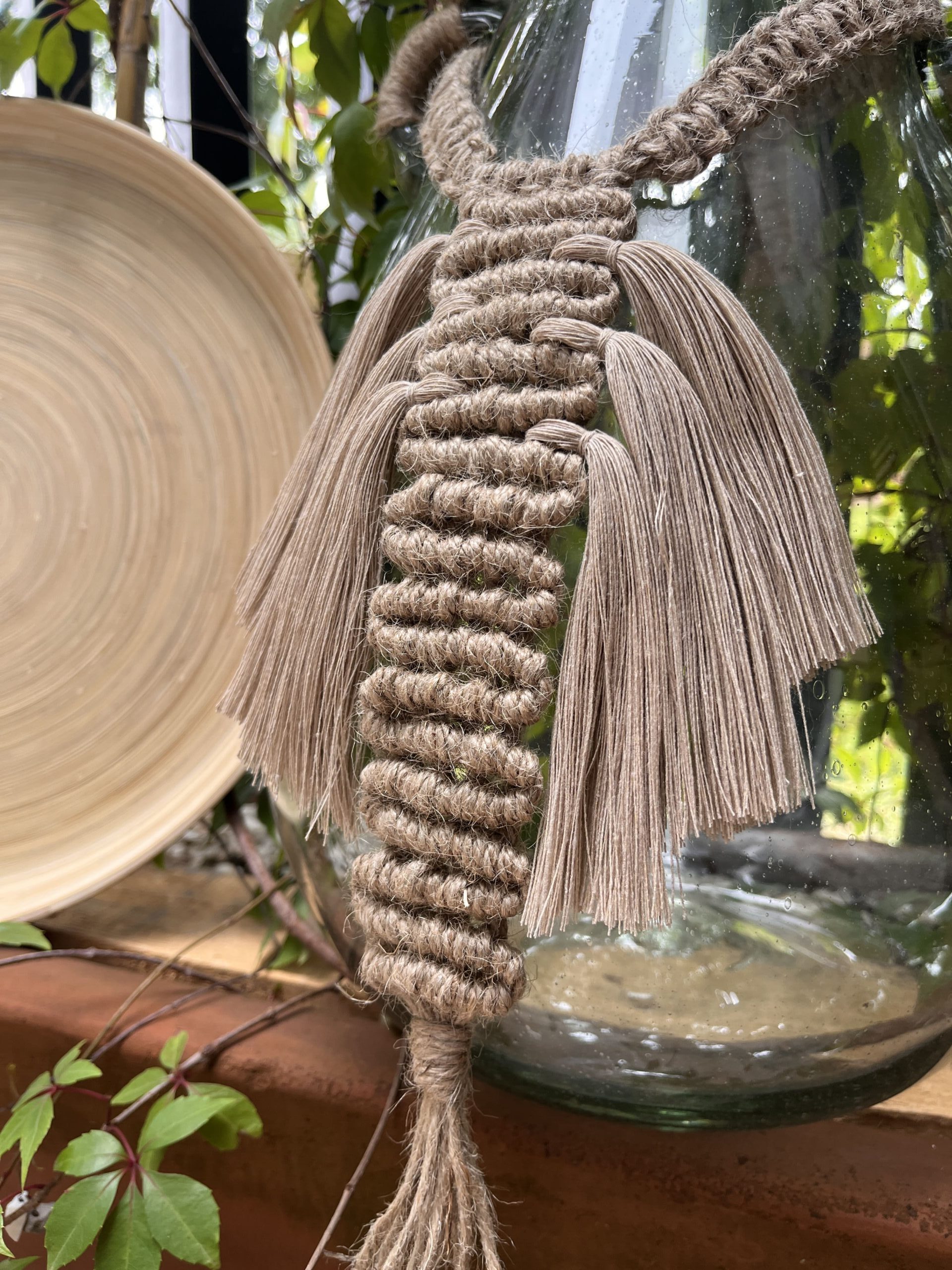 Anudado y flequillos textiles que crean un hermoso pendón de fibras naturales