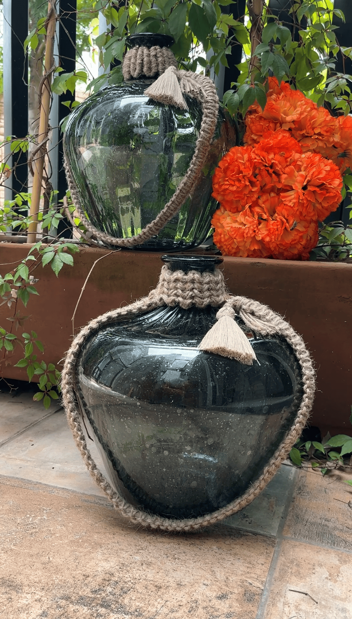 Jarrón de vidrio soplado color humo de 33cm de alto por 30cm de ancho.